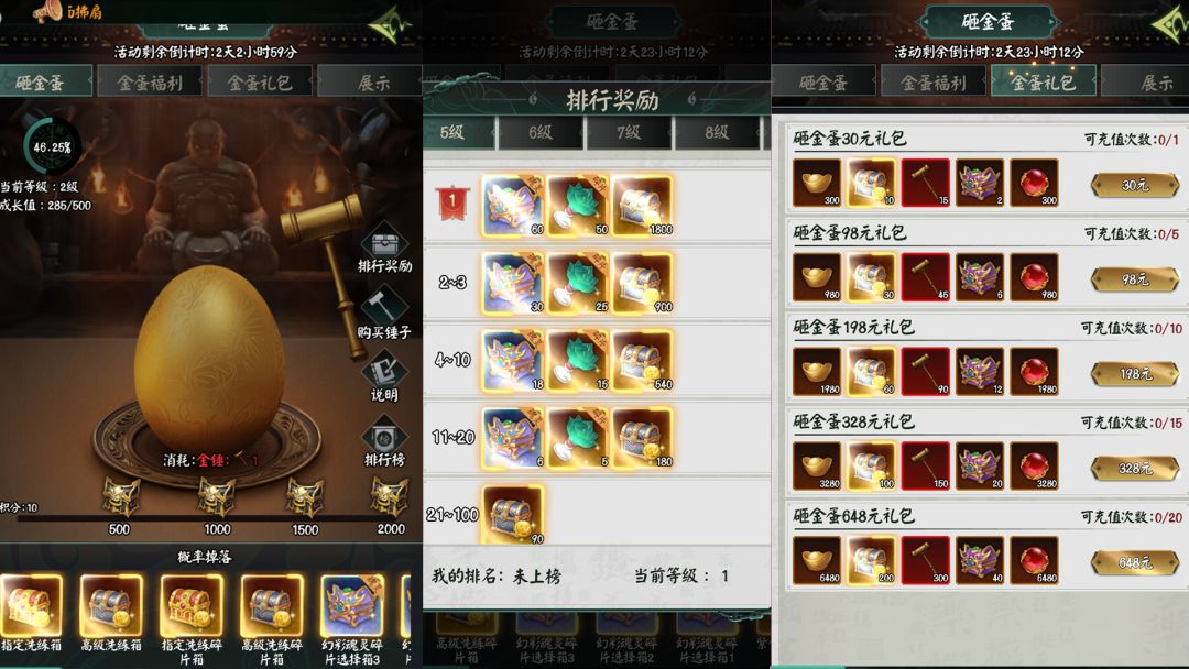 2.每次砸蛋,可以随机获得5、10、15活动积分以及1成长值,达到相应积分可以开启宝箱奖励,达到相应成长值排行奖励也会进入下一级;