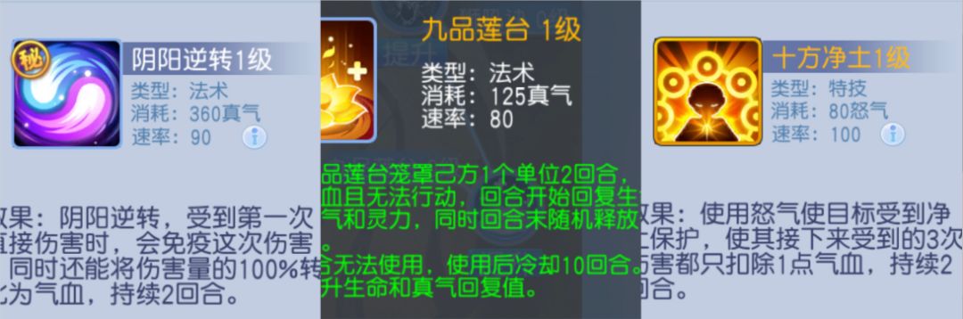 它们分别是阴阳逆转,十方净土和二转技能九品莲台!我们可以看到这些技能都称得上是预判技能,当前回合使用,如果预判成功,能够有效地避免对方的点杀,甚至还可以吸引大量的火力!同样的由于它们逆天的效果,如果说你猜不中,那么就相当于一回合浪费技能,让我们这边处于劣势状态!