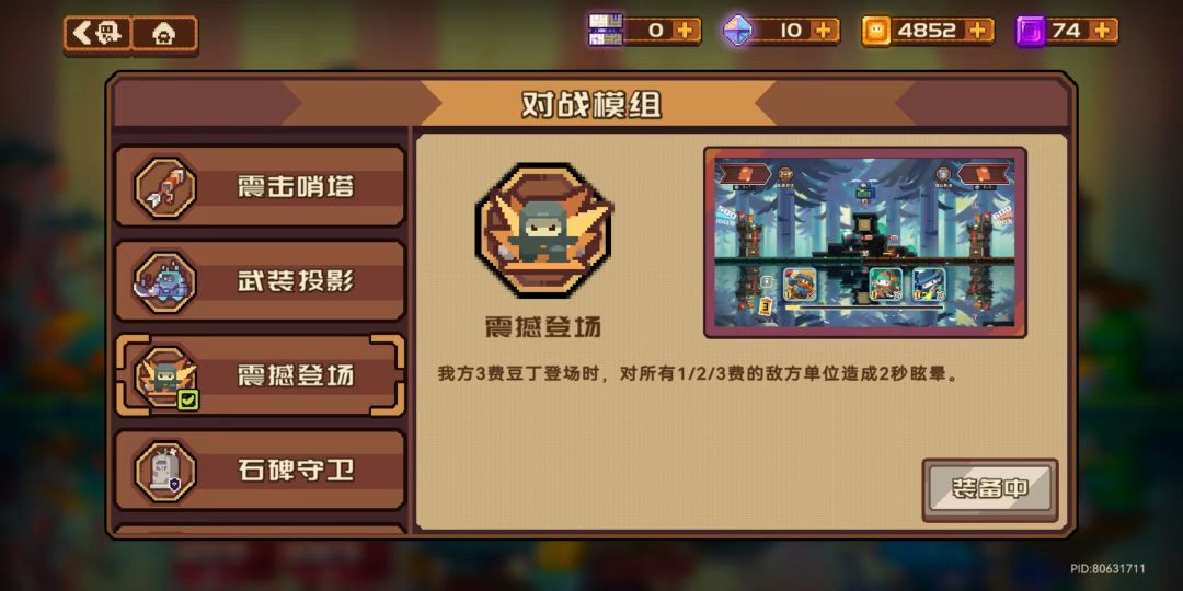 强势模组无非多言,自闭镭射流及各种小费卡组的最爱。每个投影相当于小一费的费用,在进攻方面,在前期配合豆丁用投影换取费用即可消耗塔血以换取自身的血量优势;在防守方面,764(765?)的血量超过了绝大多数战士类豆丁,贸然进攻只会让对方积累起更大的费用优势。可以说武装投影在存在期间能对对方造成巨大的压制力,以费用优势帮助玩家建立血量优势,也能帮小费卡组快速渡过三费阶段,或为操作失误提供不错的兜底能力。