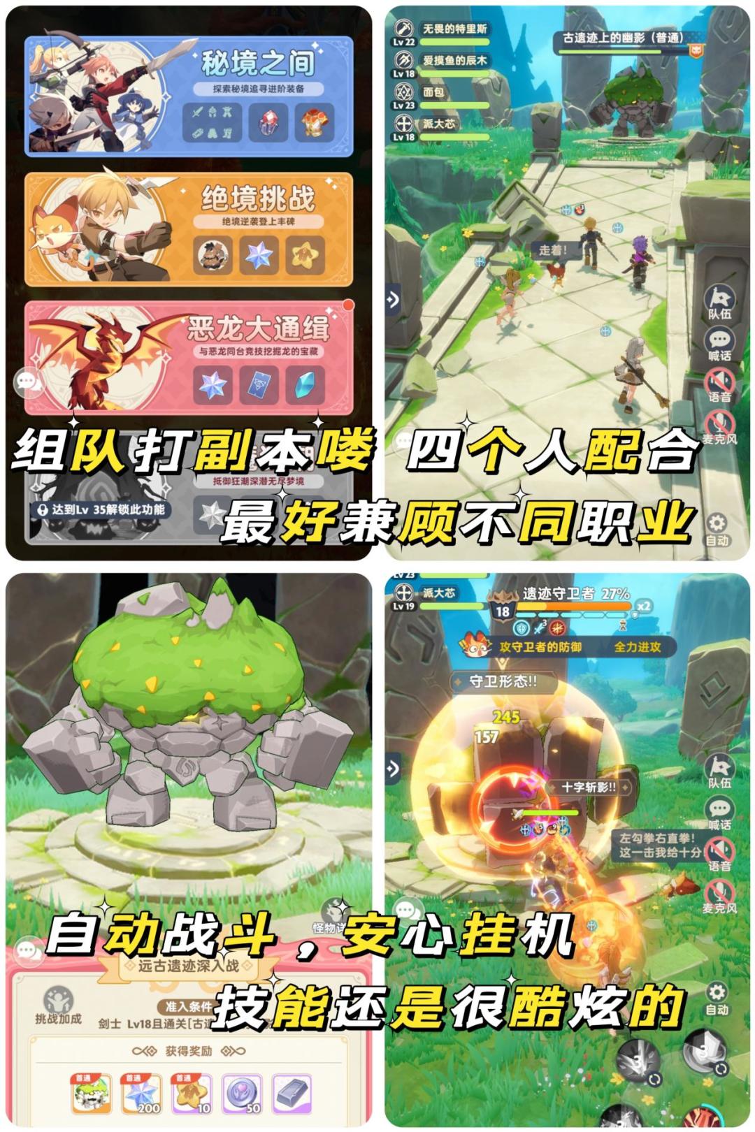 🎮 玩法非常easy,跟着主线推进,击败每个关卡的小怪和首领即可前往下一站。自动打怪模式真是好文明,彻底解放双手,简直不要太轻松,竖屏刚好方便我摸鱼。玩家可自动获得伙伴一枚,我果断选择带服事,有奶妈跟着的感觉就是安心。除了主线外,游戏也有组队试炼的副本玩法,另外加入旅团的大家庭每天给树浇浇水也挺好。