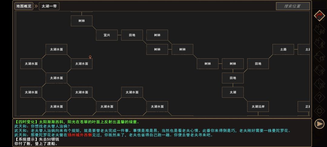 (2)前往 苏州城→立春堂→[人物:掌柜 晏天材]对话 选择:交谈,得知[赛华佗]住在太湖中的乌龟山庄。