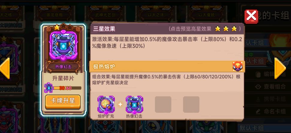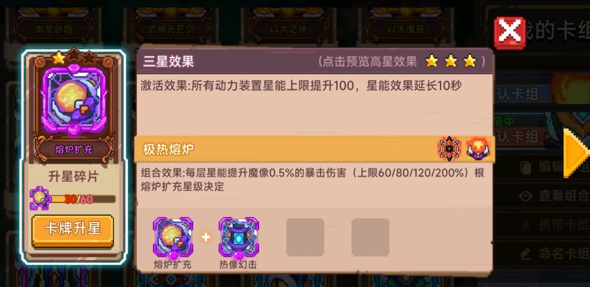 熔炉作用:增加星能上限(防止超限制导致魔像解体)其次激活两件套必带