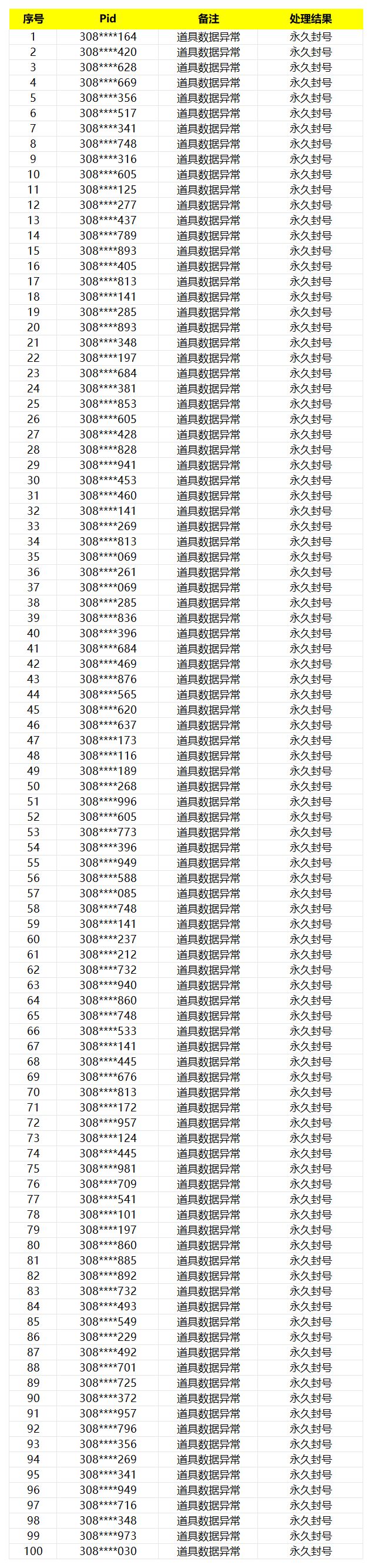本次行动针对部分渠道账号进行核实,从严查处游戏内数据异常行为,市政工已收集了相关违规账号信息,并对这些玩家进行了永久封号处理,将于此公告中予以公示。