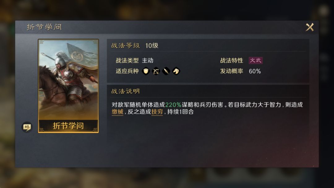 2.《文攻》:自带战法折节学问造成的兵刃伤害转化为谋略伤害 且该战法的伤害提升10%