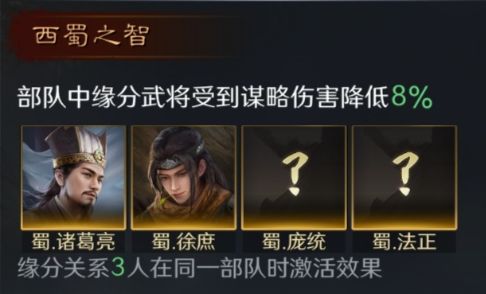 用徐庶高智力的特点作为主要输出手段。陈到的自带战法可以让徐庶同时获得恢复兵力和减伤的效果。周仓高统率抗伤的同时,还可以给敌军施加控制状态。