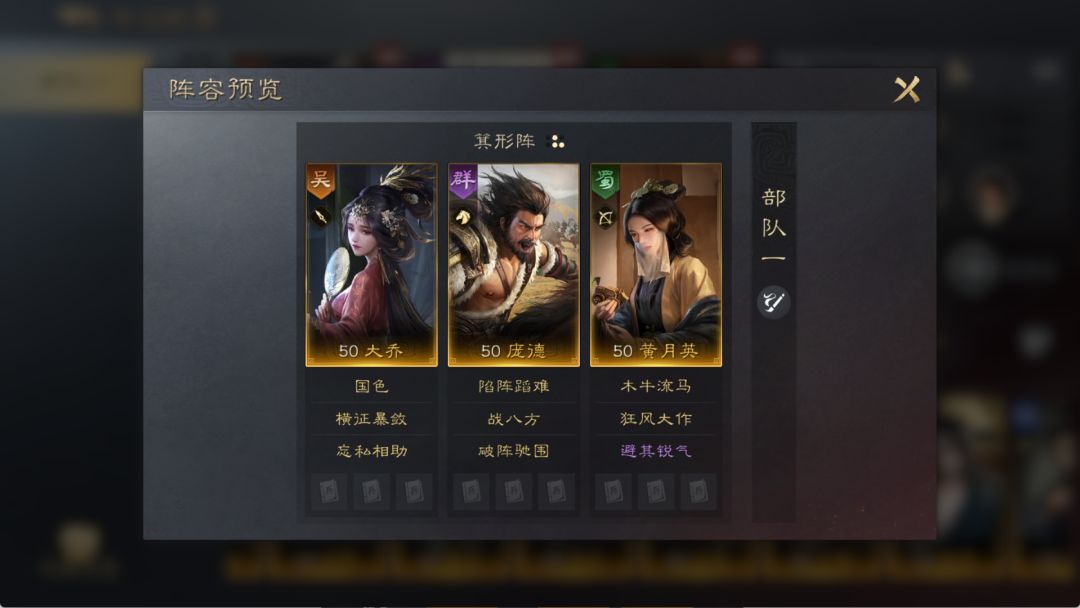 大乔给敌军施加的负面效果,可以让庞德对敌军打出更多的伤害。而庞德的自带战法【陷阵蹈难】在第3、5回合发动,刚好可以受到黄月英的【木牛流马】的增伤效果,打出更高的伤害。大乔和黄月英都可以提供治疗效果,能够给庞德提供更好输出的空间。