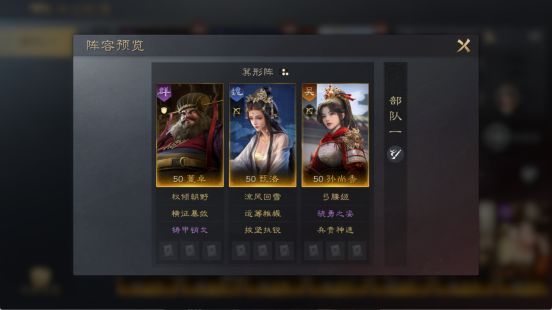 属性加点选择:甄洛全智力,董卓先攻全队第一后点统率,孙尚香全武力。