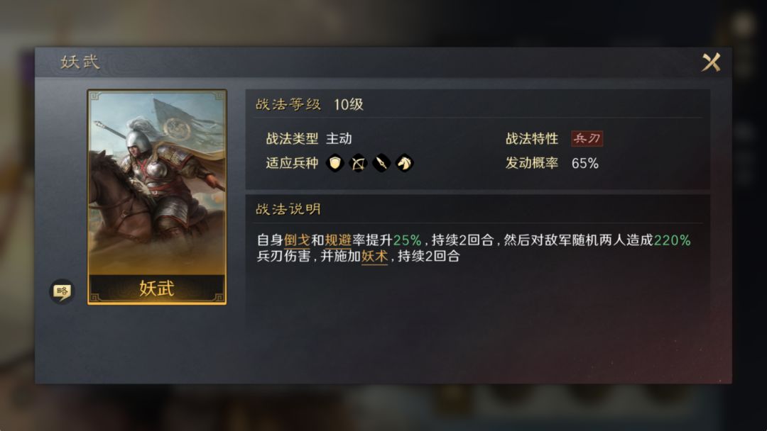 自带战法:【妖武】,主动战法,提升自身规避率和倒戈,然后对敌方两人造成伤害,并施加“妖术”状态。