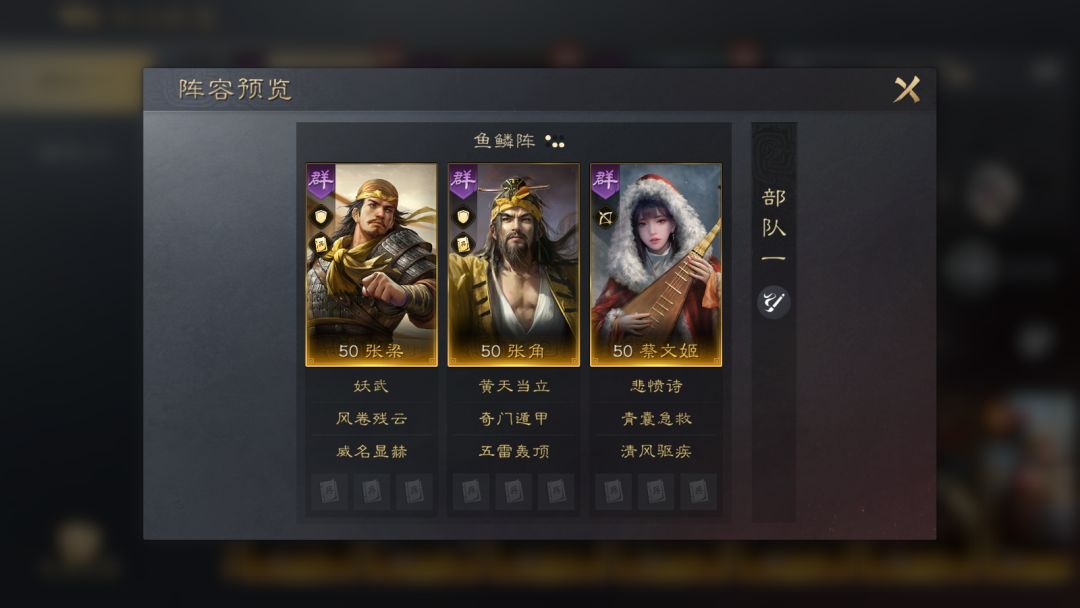 张梁搭配蔡文姬,张梁在自身高规避率的前提下,蔡文姬提供的恢复和“抵御”,也能使张梁作为前排的生存能力更强。蔡文姬提供的“抵御”和治疗也能弥补部队中缺少回复的短板。而张角则能在张梁给敌军施加异常状态之后,打出更高的伤害。