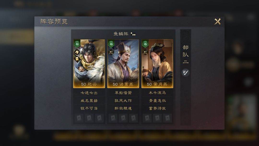 这个阵容能够激活“五虎上将”缘分,部队中武将的会心几率提升,配合鱼鳞阵能有更高的爆发力。【坚如磐石】能让赵云“嘲讽”敌军,创造机会多次触发【七进七出】。关羽的【水淹七军】和【战八方】能够对敌军全体施加异常状态,让马超的【纵马横枪】能够打出更多的爆发伤害。