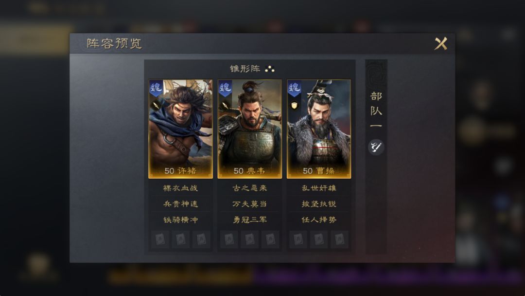 曹操的自带战法【乱世奸雄】为部队整体提供减伤效果,保证典韦、许褚的存活率。典韦作为前排吸引敌军进攻,避免低统率的许褚被攻击,还能对敌军进行“反击”打出高额伤害。许褚依靠自身战法【裸衣血战】,能够对敌军输出爆炸伤害。