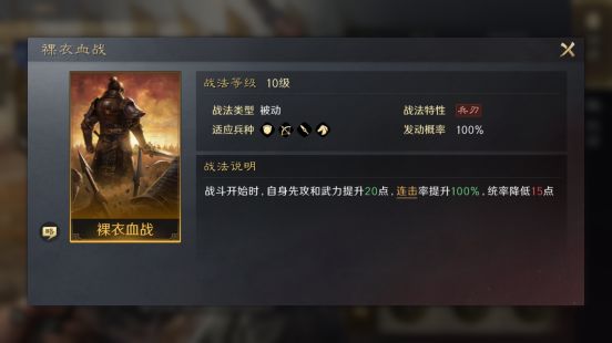 自带战法:【裸衣血战】,被动战法,战斗开始后提升自己的先攻和武力值以及连击率,但会降低自身的统率。