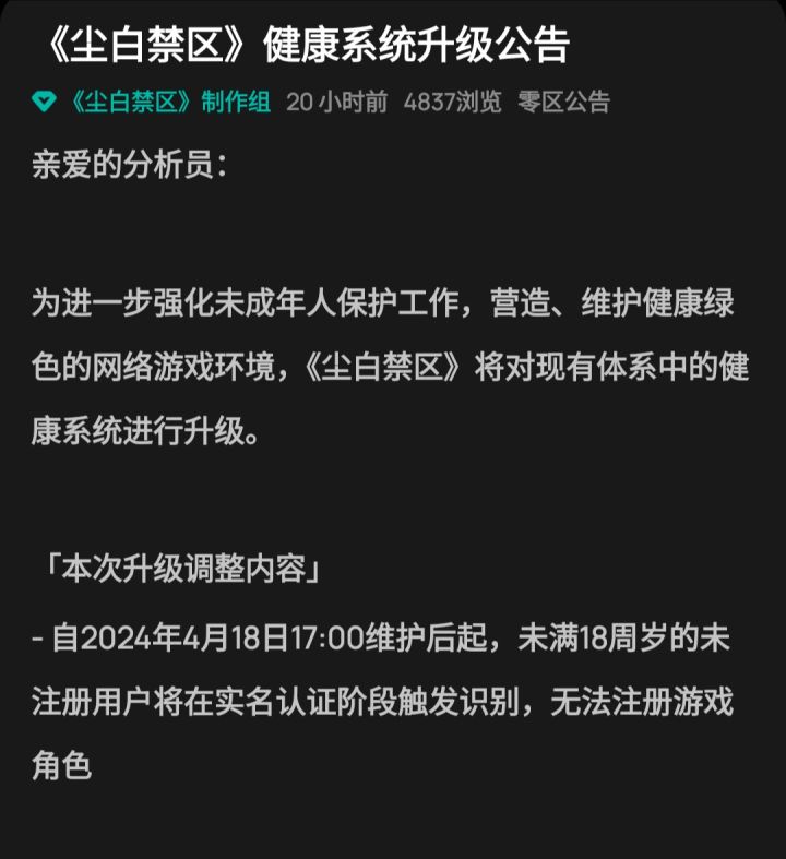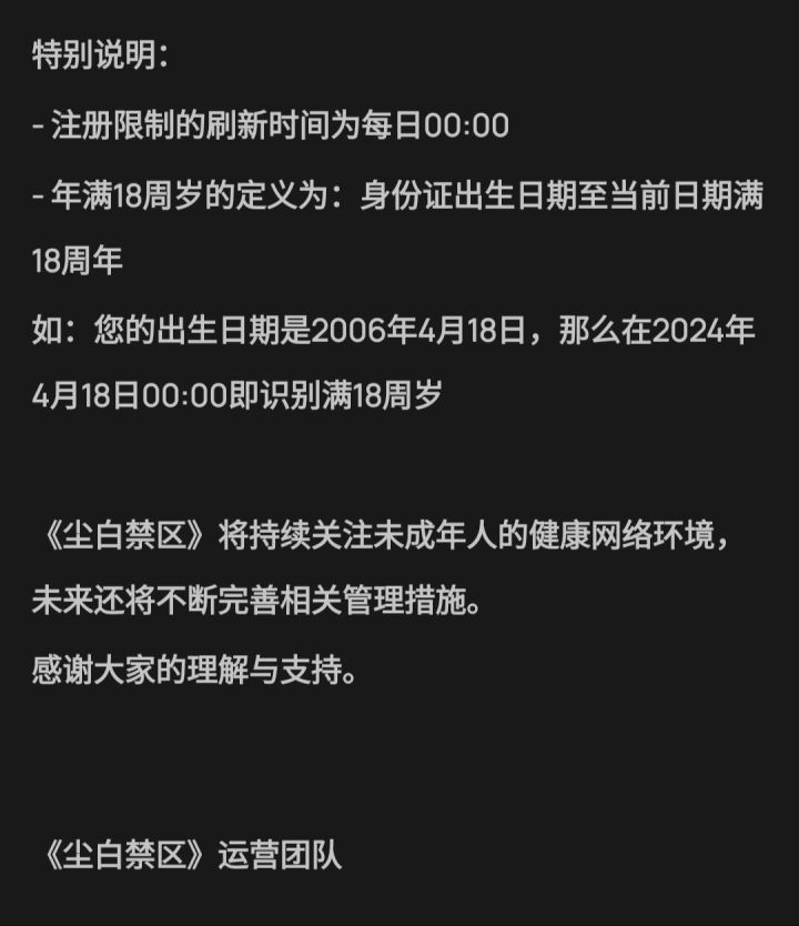 《尘白禁区》项目组近日发布了健康系统升级公告,公告称实名认证未满18周岁的未注册用户将无法注册游戏。这一更新将在4月18号17:00维护后生效。