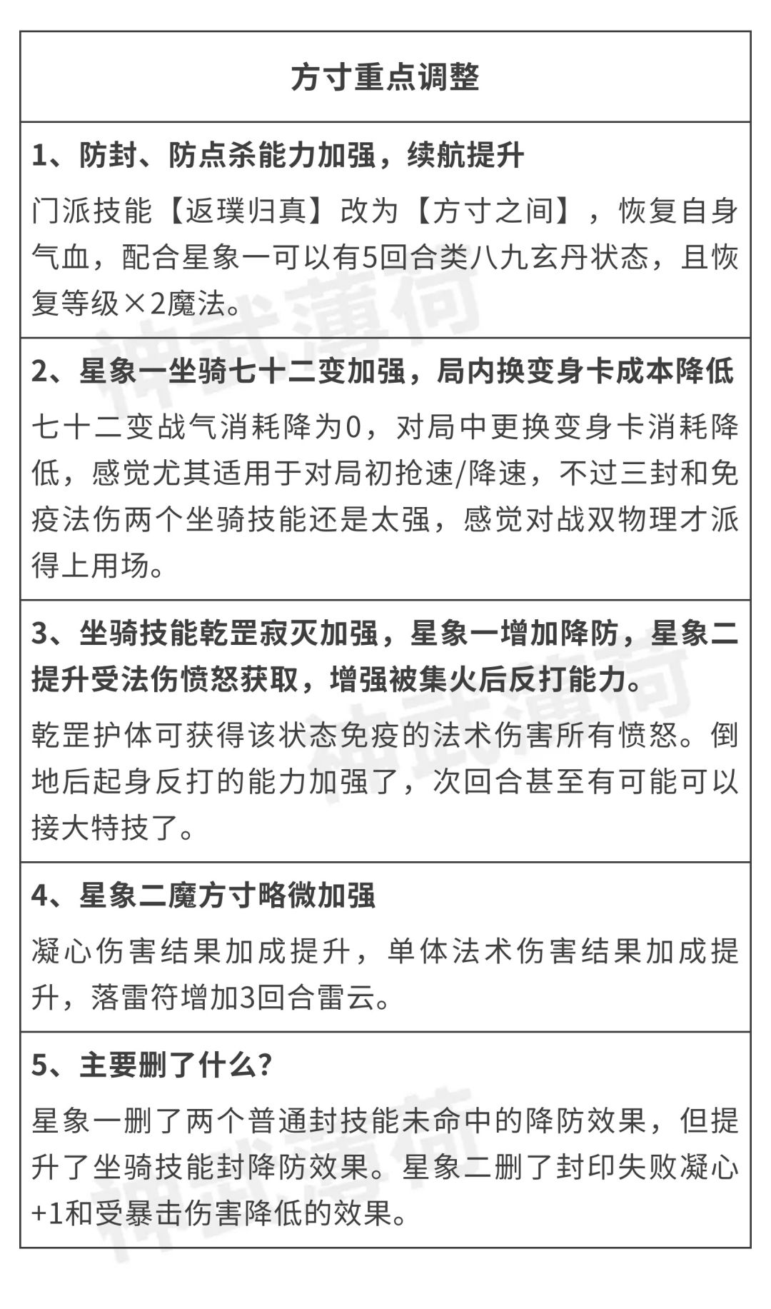 具体到各个门派调整的方向不太一样,整理了调整前的截图和调整后的截图,给大伙对比着看看策划到底改了什么?调整前后的变化是什么?从方寸开始一个个看吧。