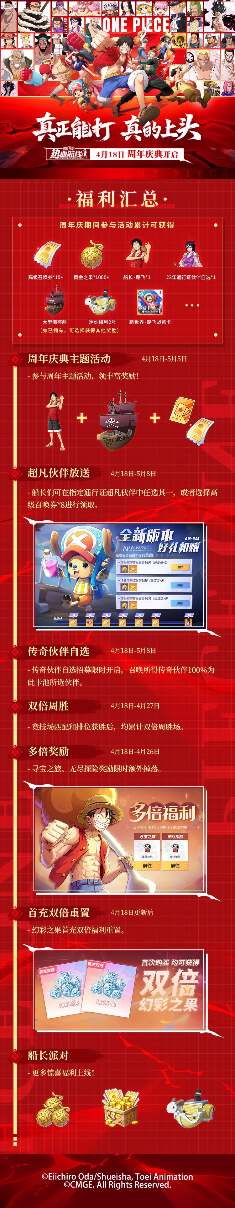周年福利大放送!累计可获得高级召唤券*10、黄金之果*1000+、传奇伙伴*1、通行证伙伴、2艘载具、战意卡等等等等丰厚福利!