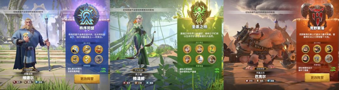 秩序同盟秉承秩序,圣泉之翎守护大自然,荒野聚落崇尚武力。