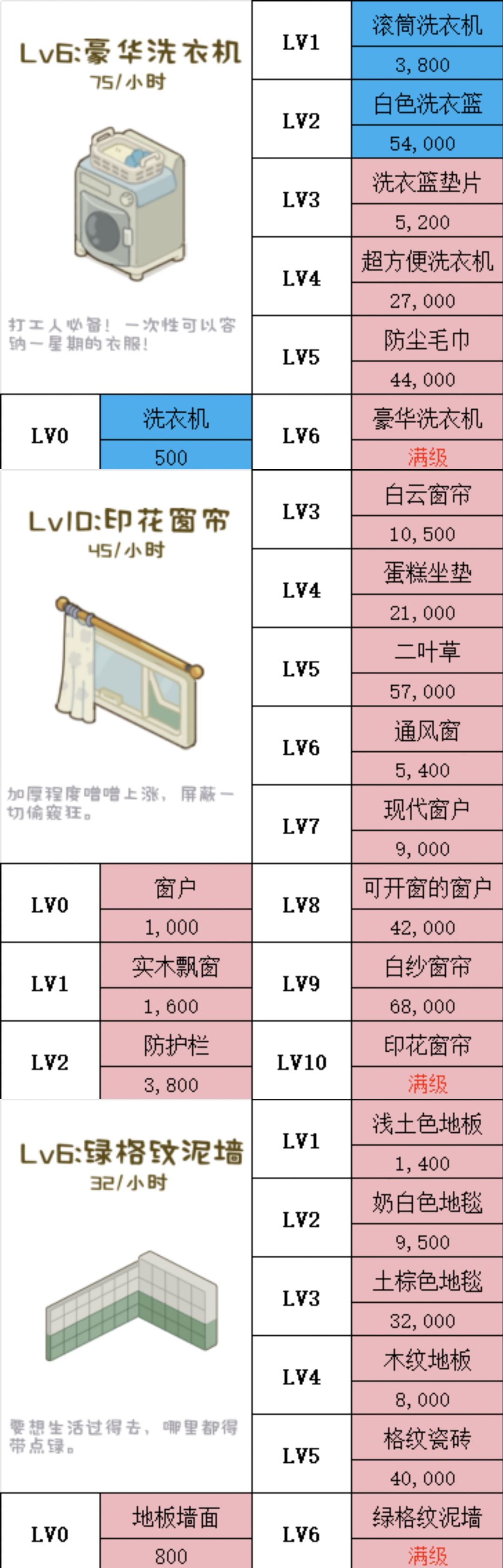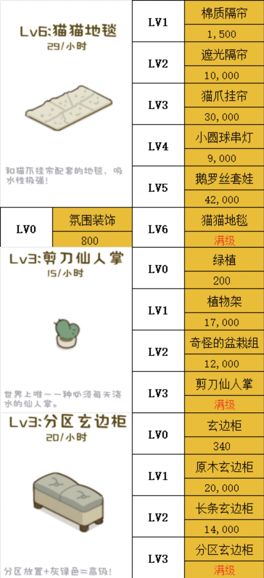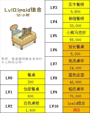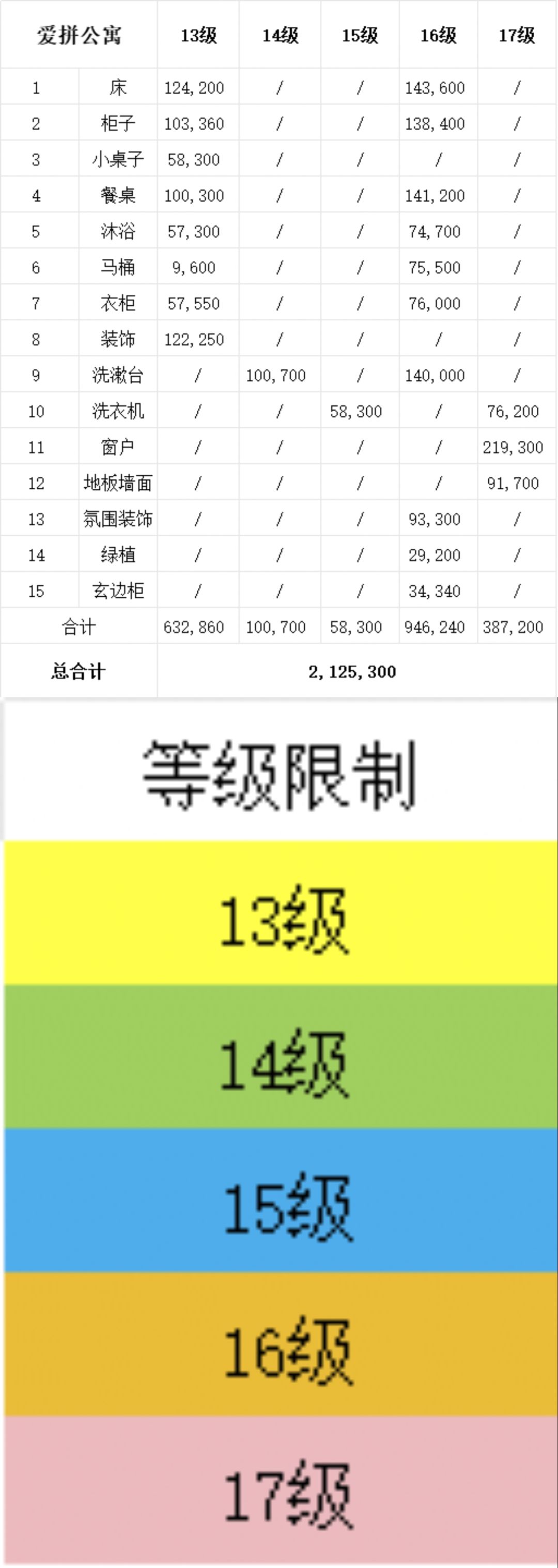 各个等级对应家具及所需金额(图2)