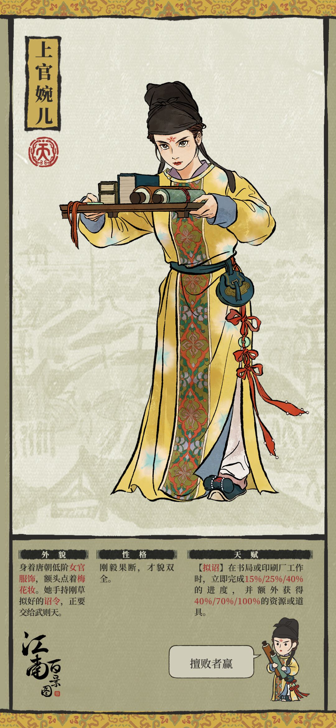 一位身着锦衣的贵人突然来访,她仪态万方,不怒自威,扫视了一遍日夜与笔墨相伴的宫人们:「宫教博士已在内文学馆授课数月,可有人能草拟诏令?」