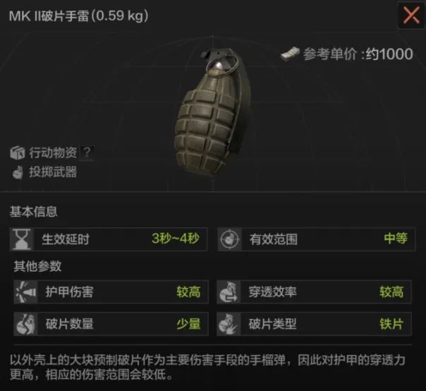 MK II破片手雷是暗区中出镜率很高的投掷物,它造成的破片数量和爆炸范围较低,但破片的穿透性更好,因此也有不少玩家更青睐于使用它来打高级地图。