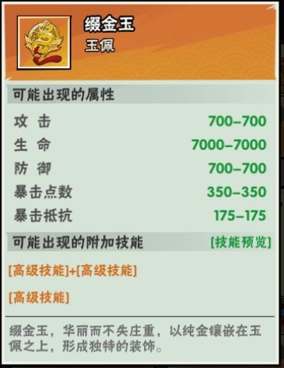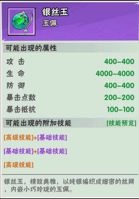 蓝色玉佩/紫色玉佩上会出现基础的附加技能,而紫色玉佩/橙色玉佩上会出现高级的附加技能。