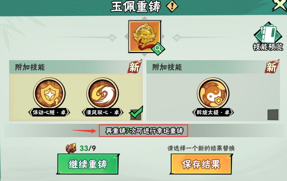 一直刷不出高品质的技能怎么办?少侠不用担心!玉佩重铸到达一定次数后,下次必为幸运重铸,即必获得高品质的技能组合。