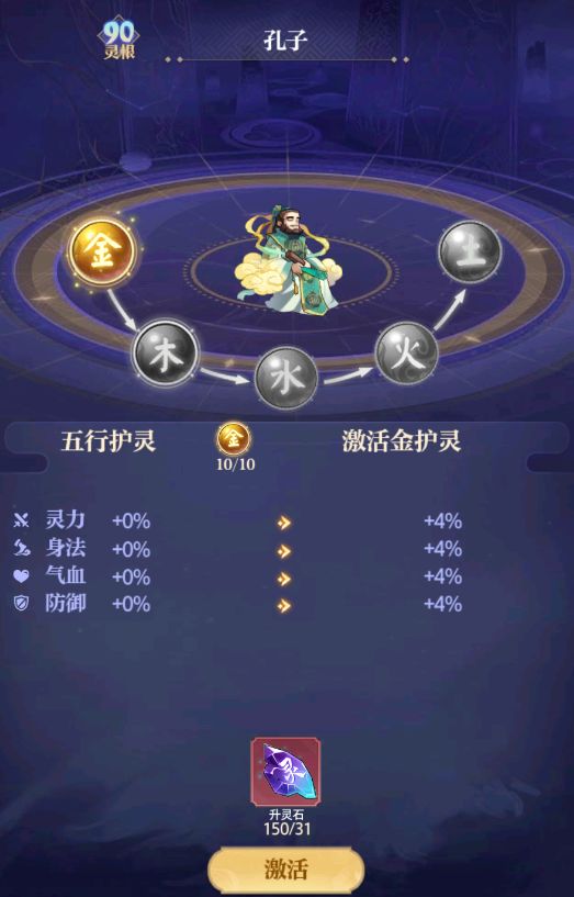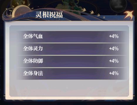 每激活一颗灵珠都将获得灵根祝福:全体气血、灵力、防御、身法的百分比全局属性加成。