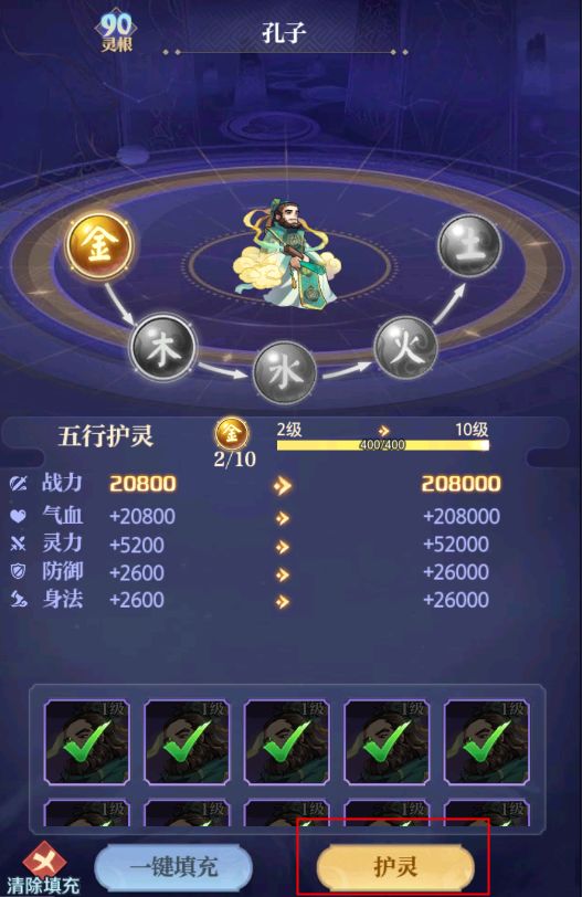 进入仙灵的灵根飞升界面,选择同名卡牌,提升五行灵珠的等级。