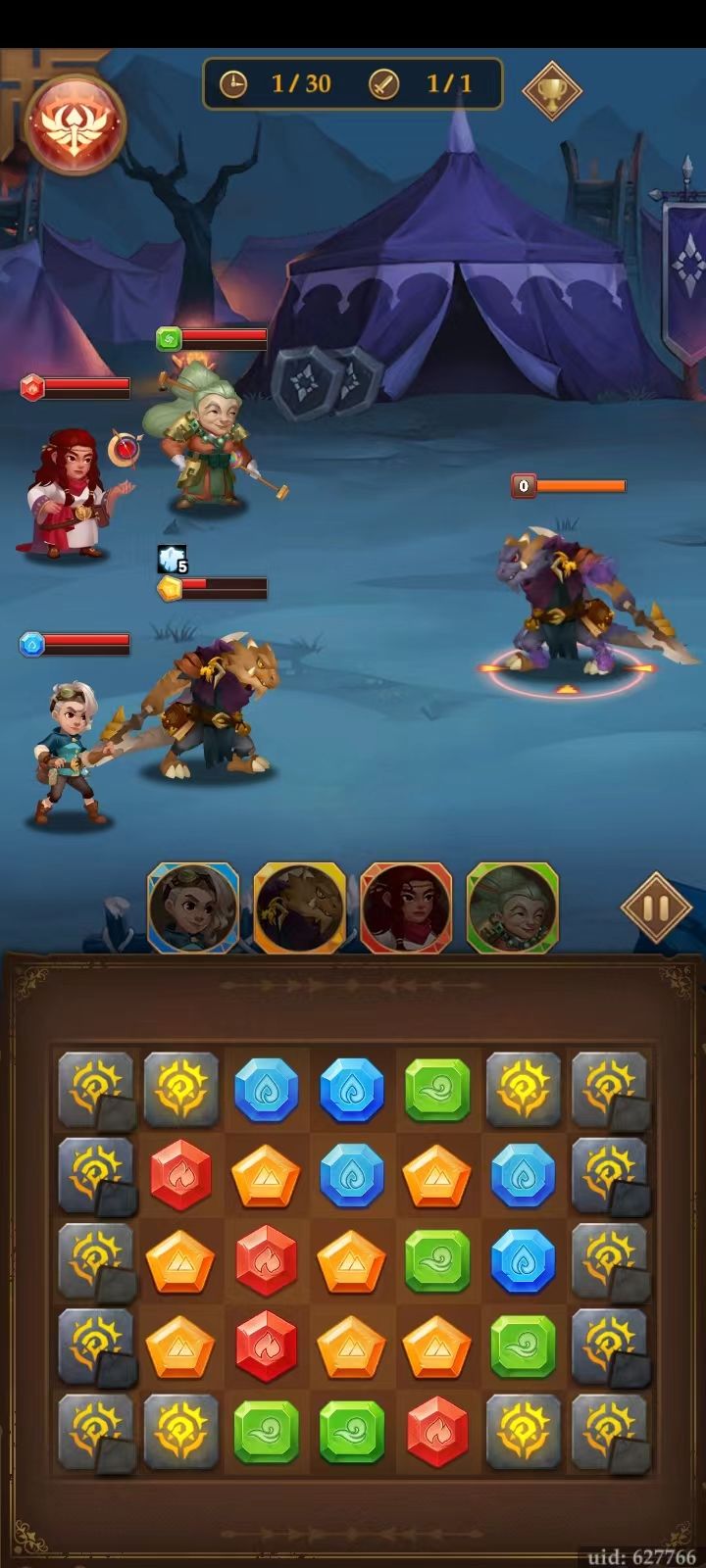 “重点来了”--这个关最考验的是棋盘的星纹石块!一定要每一次只消除一块,而两边的石块是需要消除两次,所以你的消消乐功力不是消的多,而是消得准确。每一次消除一块石块就会击晕,这个还是要多练习几次。当然没有消除到石块也不是不行,你能抗住他一顿撸就行。一般我都是先从最上面2颗或者最下面两颗入手。(注意,每次消一块是最好的)新手来说开局是一个坎的话,第二个坎就是罗兰的第二条血量,当你打完第一条血量,他就是狂暴,再次撸你一回3!注意满星奖励是不能出手4次,所以你的运用就是要他出手4次前把两管血撸死。