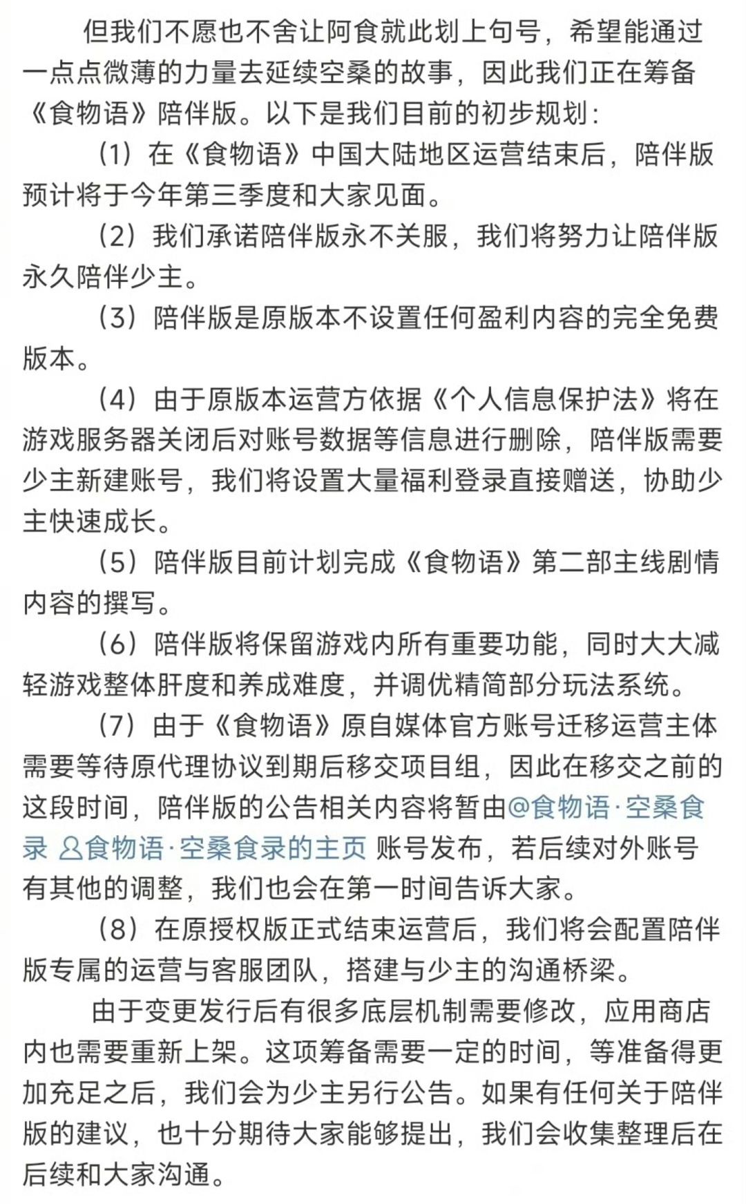 由于《食物语》原有官方账号需要待代理协议到期后进行运营主体变更,因此在变更完成之前的这段时间内,有关《陪伴版》的相关进展和具体推出时间,请少主留意开发商广州天梯网络科技有限公司的相关公告。