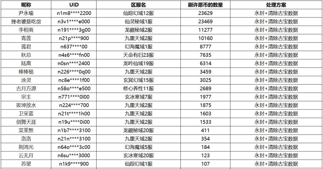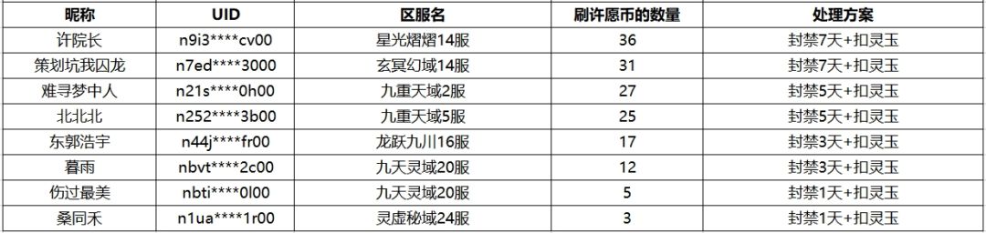 我们将按照异常获取许愿币的数量进行不同时间的封禁,并且扣除等值灵玉(1古宝币=200灵玉),账号最高封禁7天,最低封禁1天。