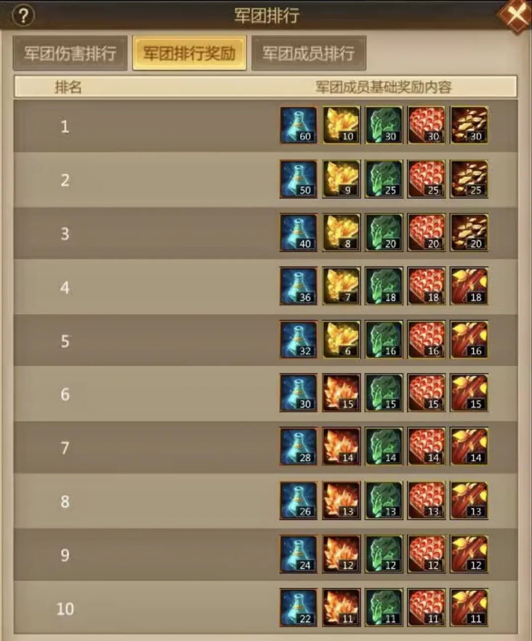 *注:根据各个排名的军团内成员的奖励为——排行1-10名可获得3倍基础奖励,11名-20名可获得2倍基础奖励,21名及之后可获得1倍基础奖励
