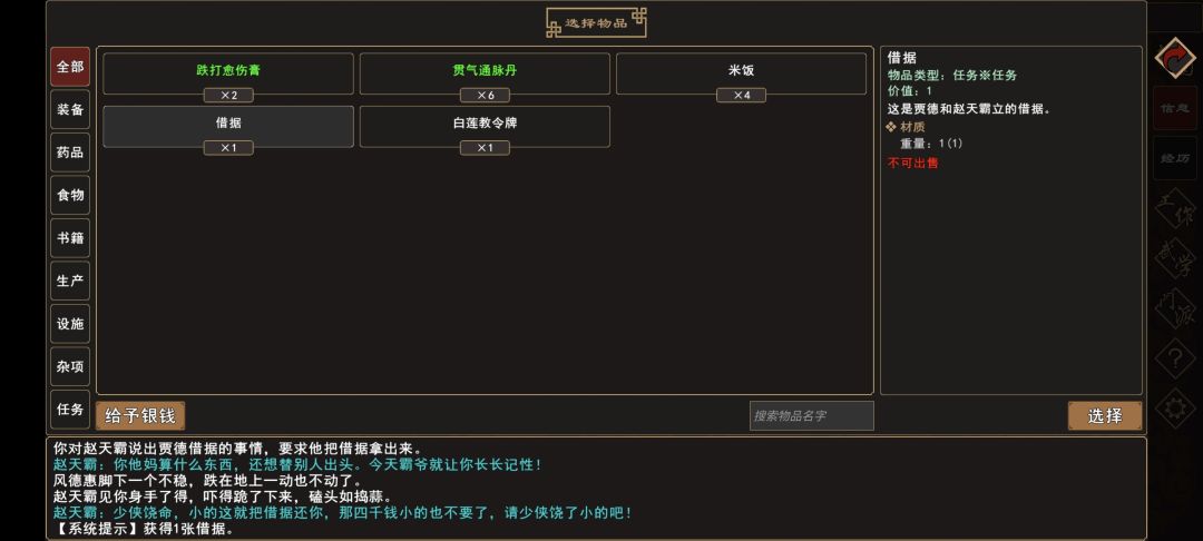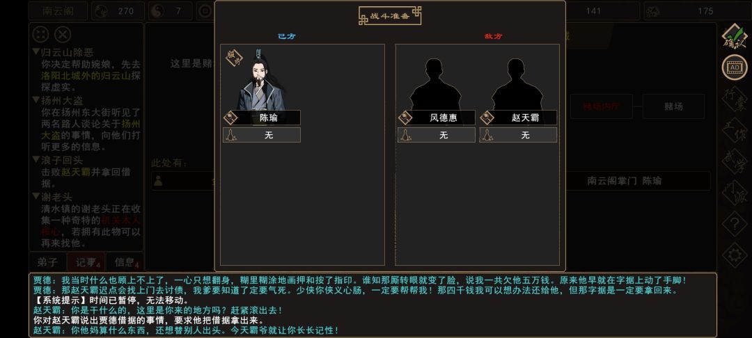 (4)需要帮助[贾德]拿到借据,前往 扬州城→赌场→赌场内厅,触发战斗,战斗胜利后拿到[借据※任务]。