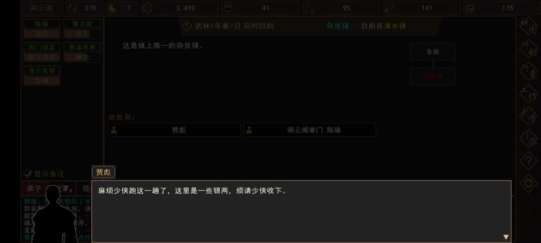 (2)前往 清水镇→杂货铺→[人物:贾彪]对话,完成任务。
