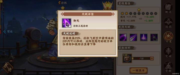 最近孙权返场,作为老牌年将刚开始出来的时候非常强势,因为他有霸体,开完大招后的二技能破霸体,三冠孙权更是能飞天一边躲避对面技能一边抓人。那时候的孙权伤害也高可以打高层试炼,经过了这么多版本,下面来看看孙权目前在游戏中的优劣势。 ★优势:孙权虽然经历过强度下调,伤害有所降低,但打打低层试炼还是没问题的。另外军团远征最后的boss曹彰,每上阵一个吴国武将就提升10%的攻击,加上孙权有易伤技能,所以可以用来辅助。目前孙权排位只能用来辅助了,因为强势排位武将太多。如果是三冠孙权无论排位和极限竞技都还是可以打一打的,尤其是极限竞技,场地小,三冠孙权的飞天后抓人几乎躲不掉。另外开大后的孙权二技能可以抓取霸体,距离也很远。 ★劣势:孙权刚出来的时候身板就有点脆,尤其是和对面拼招的时候,孙权一个技能还没放完眼看着自己血条就要空了,目前霸体武将太多根本不怕拼招,孙权一技能和三技能收招太慢容易被对面一套打残,所以现在孙权排位建议放二号位或三号位,切将出来用1技能霸体顶一顶。 目前年将刘备出来后孙权更没啥用武之地了,只能说一代版本一代神吧。