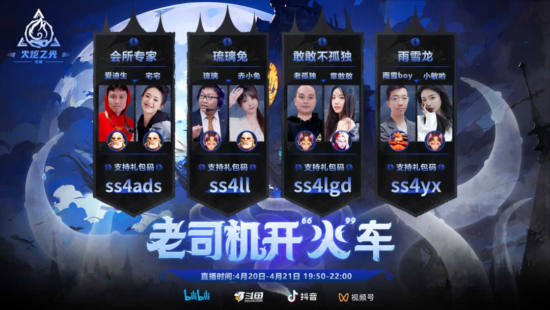 在4月20日和4月21日两天晚上19:50 - 22:00,将由四位老司机带着新伙伴分成四组一起升级刷刷刷,各位猎人可以在B站、抖音、斗鱼以及视频号的官方直播间进行收看这次活动~