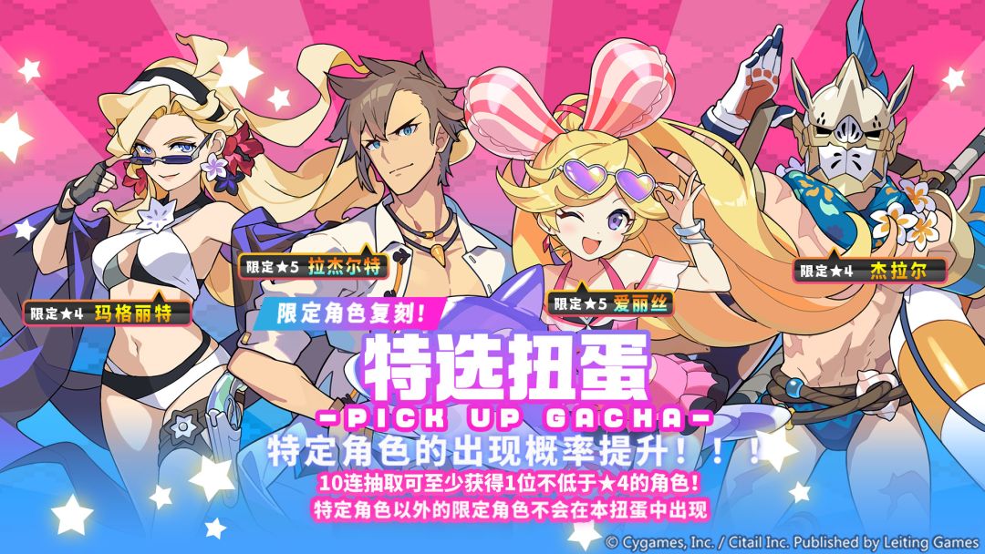 (3)5月16日至5月23日,开放泳装主题复刻扭蛋池,包含限定★5角色「爱丽丝」、「拉杰尔特」、限定★4角色「杰拉尔」、「玛格丽特」的抽取,且出现概率提升!