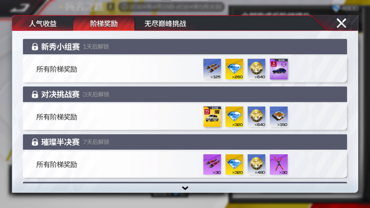 车手每上升一阶,都将获得更为丰厚的【人气收益】,海量金币丰厚升级零件都在前方等你来拿,小可偷偷告诉车手,别看这个收益“单价”低就不当回事,小可看到策划哥哥靠这个攒了2000+钻石!(人气收益有着2周的积累上限,车手们要记得及时前往【扬名之路】领取奖励)