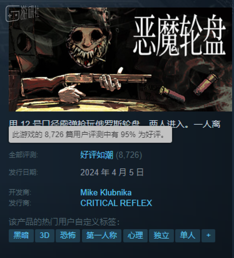 在某些电影中,俄罗斯轮盘赌是帮派成员间的“勇气挑战”多亏了电子游戏,现在我们可以安全地在自己家的电脑前获得这种体验——目前Steam上的《恶魔轮盘》已经积攒了8700多条评测,好评率高达95%,而现在离这款游戏正式上线还不到一周时间: