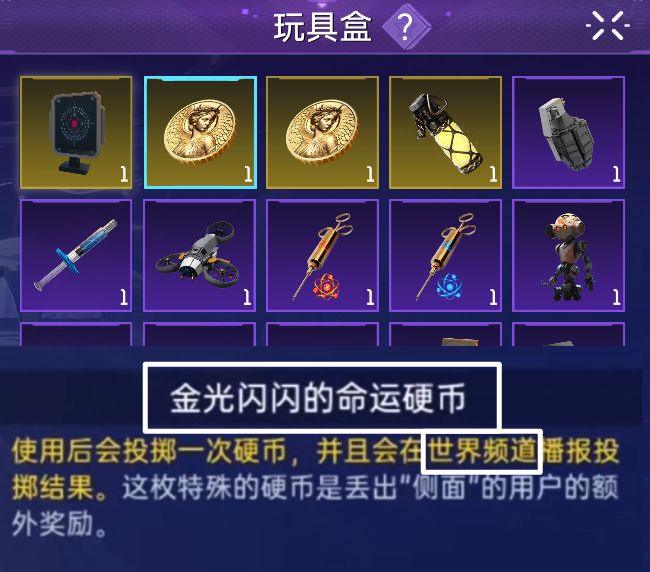 硬币掷出,附近频道播报投掷结果。小两口陷入沉默,但梦千却是一阵狂喜——因为丢出侧面,直接解锁了隐藏奖励「金光闪闪的命运硬币」,它的投掷结果还会直接在世界频道播报哦!