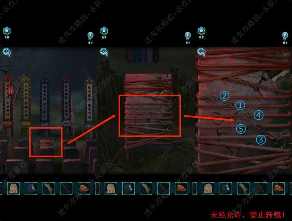 71.调查此处,根据上一步骤中得到的提示,按照如图所示的顺序,依次点击绳结。71