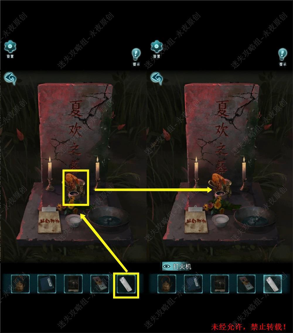 76.进入夏欢之墓场景,放置【牛舌】【猪耳】【龙眼】【鸭掌】【一束鲜花】【蜡烛】。笔者注,这六项物品没有摆放的先后顺序,只要均放置上即可。对蜡烛使用【打火机】,点燃蜡烛。76