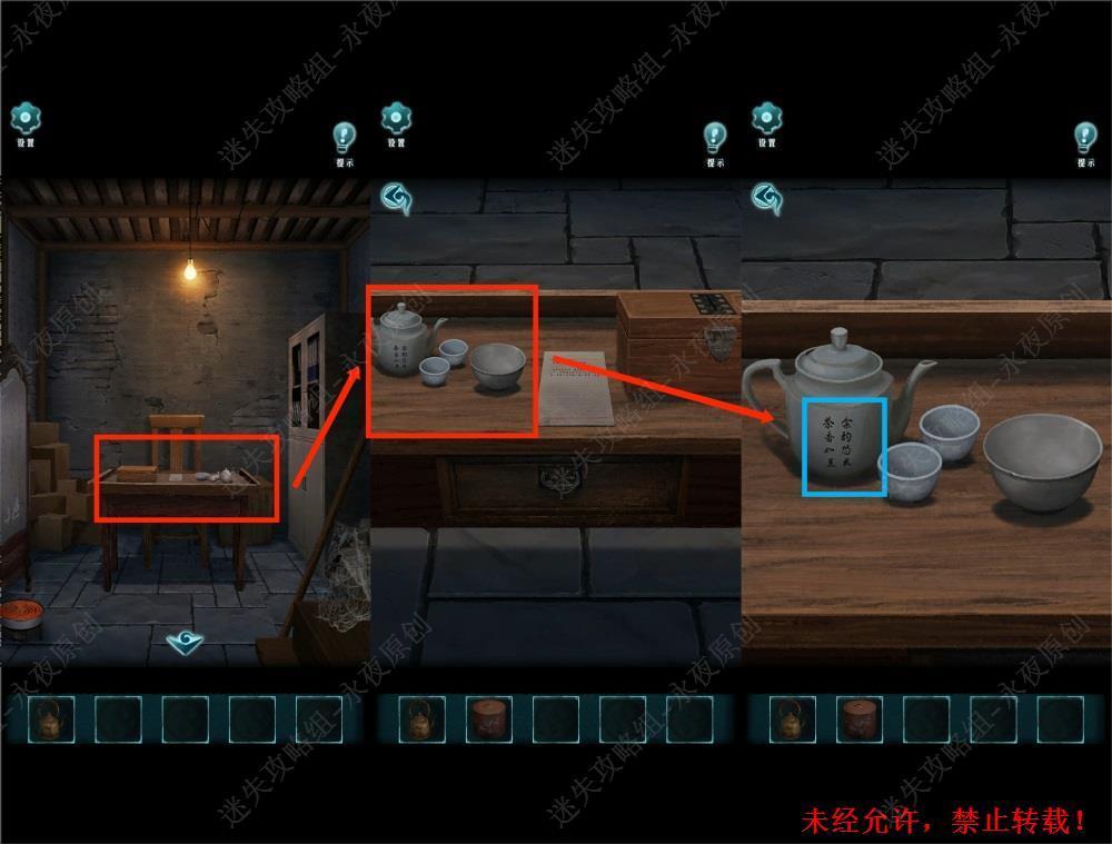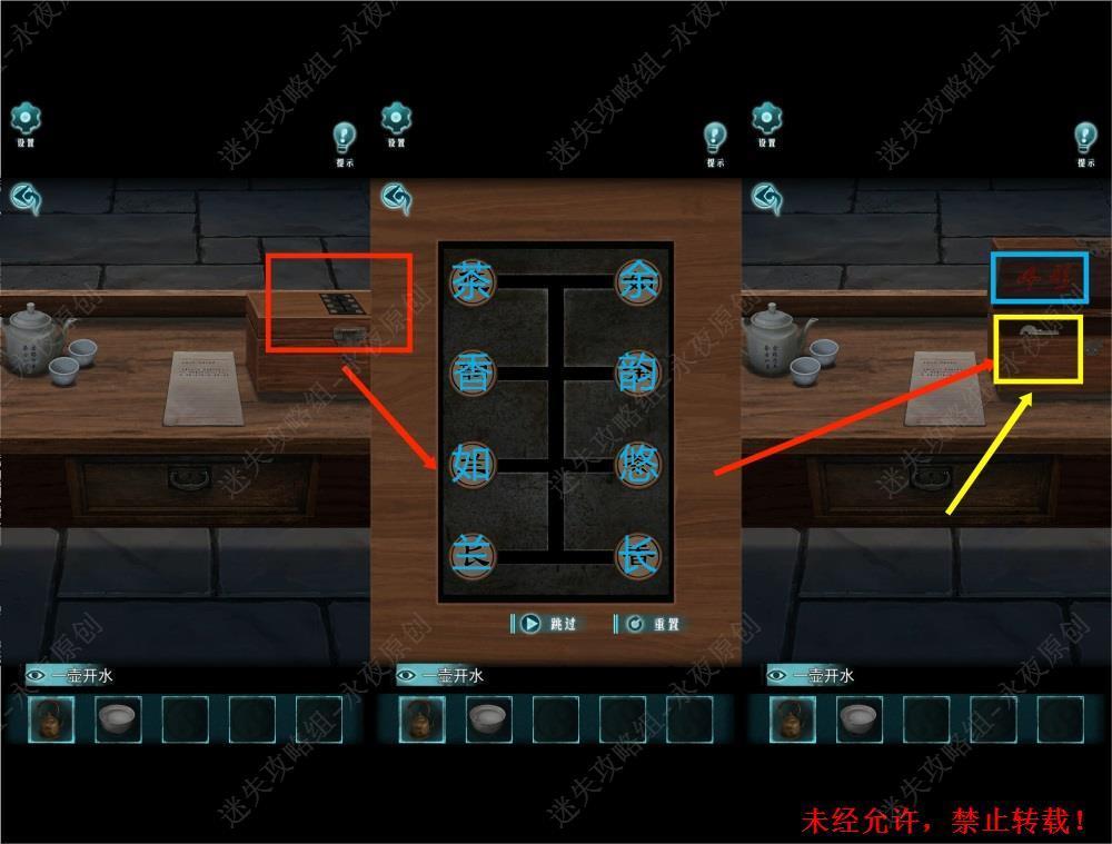 50.调查此处,解锁移动字块小游戏,需要根据茶壶上的字样,将字块移动至与茶壶上的字样一致。拾取【铁钥匙】,同时可观察到箱盖内部上的“4形”字样。50