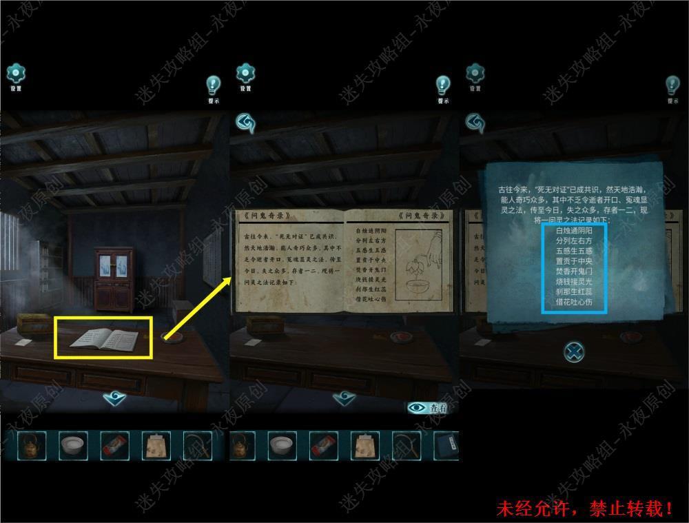 58.进入右侧办公室,调查此处,拾取【问鬼奇录】。得知问灵的顺序是摆放蜡烛和五感贡品,焚香,烧钱,摘花.58