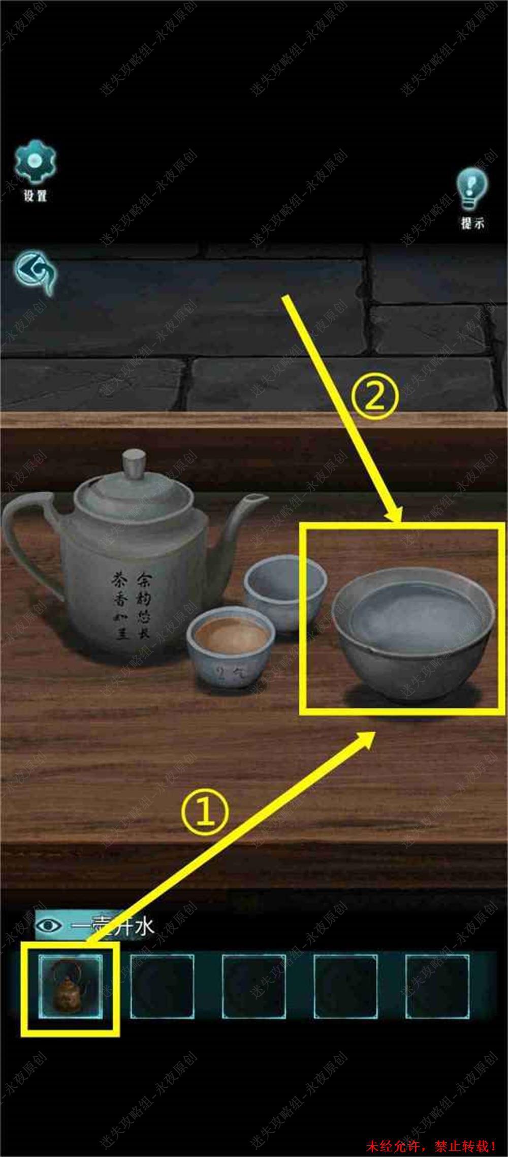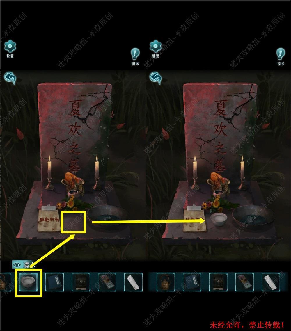 77.放置【清水】。笔者注,放置【清水】前,需要完成上一步骤,如提示顺序不对,请检查是否存在遗漏物品未曾放置或蜡烛未曾点燃。虽然《问鬼奇录》中并没有提及放置【清水】这一步骤,但如果不放置【清水】,将无法进行下一步骤。77