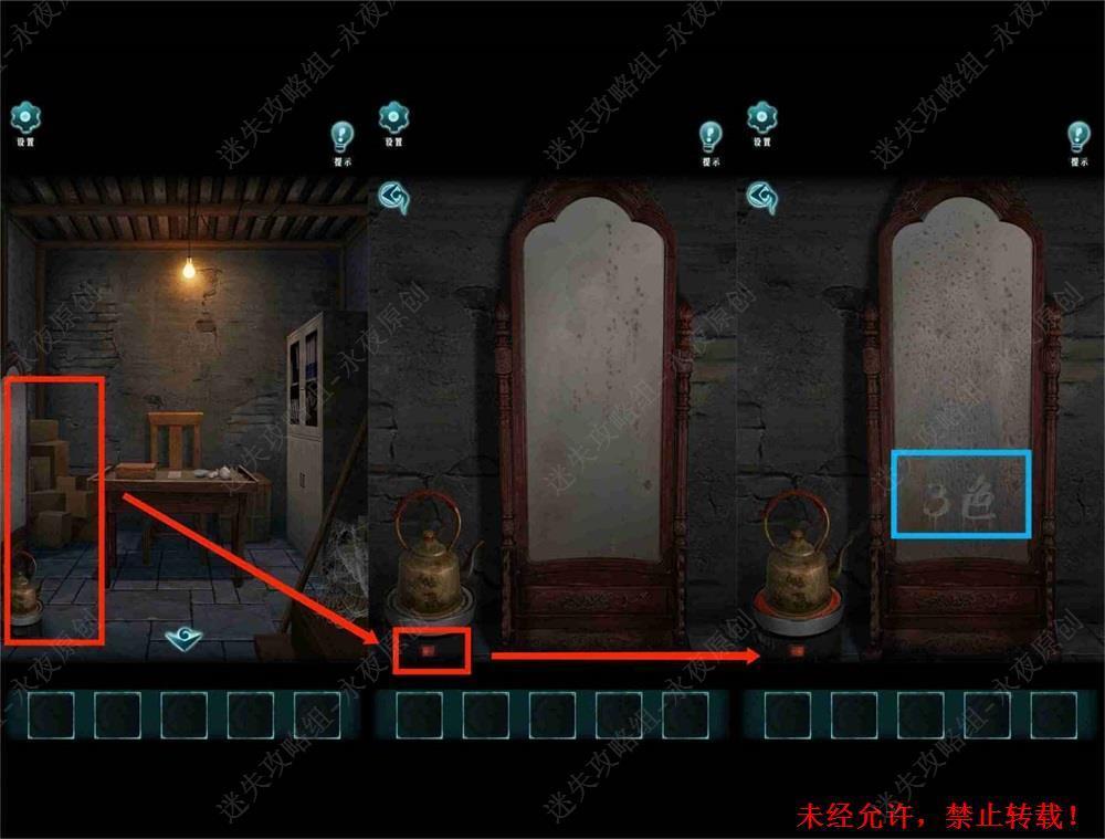 44.调查此处,点击开关,开始烧开水,可清晰观察到镜子上的“3色”字样.44