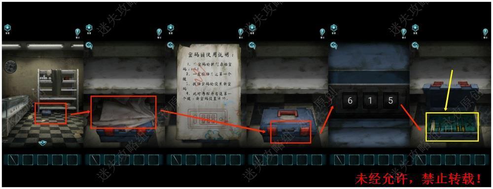 124.调查此处,捡起使用说明,解锁密码箱。调查此处,在密码箱处输入615,拾取【螺丝刀】124