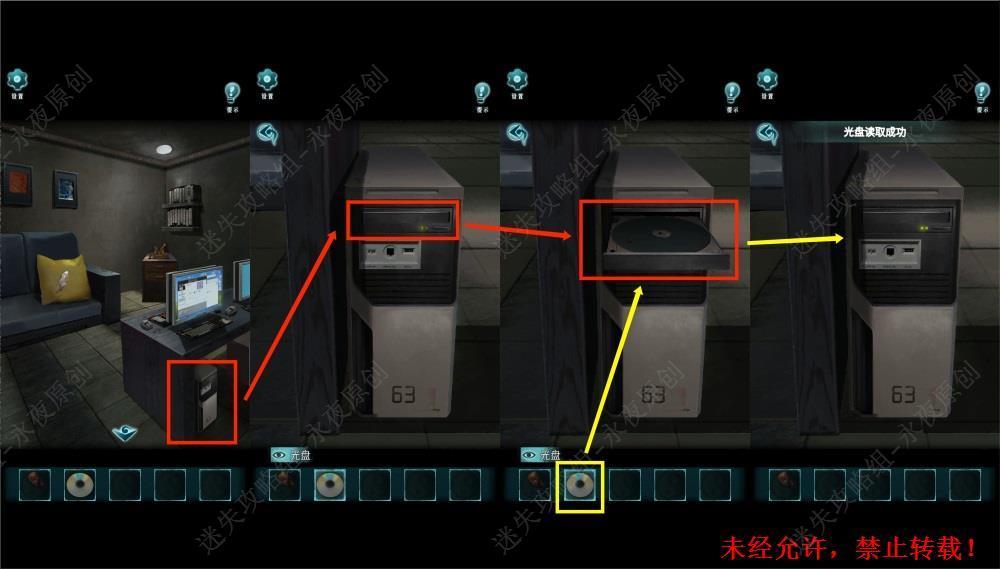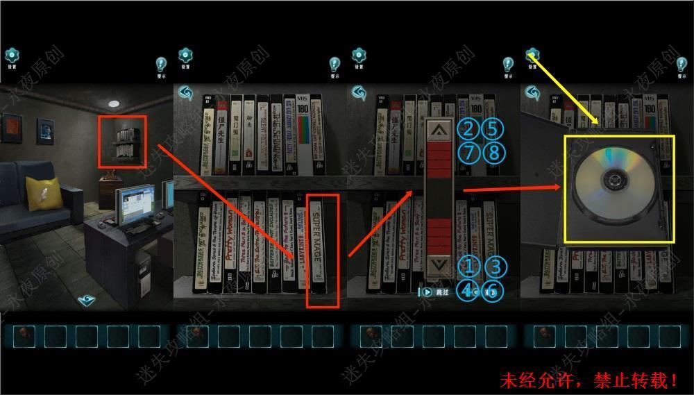 158.调查架子,调查名为SUPER MAGE的光盘盒,按照下上下下上下上上的顺序点击按钮,打开光盘盒,拾取【光盘】。笔者注:此处光盘盒谜题没有线索,需要玩家进行二选一试错,点错就需要重头再来。158
