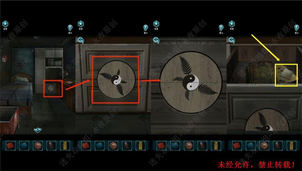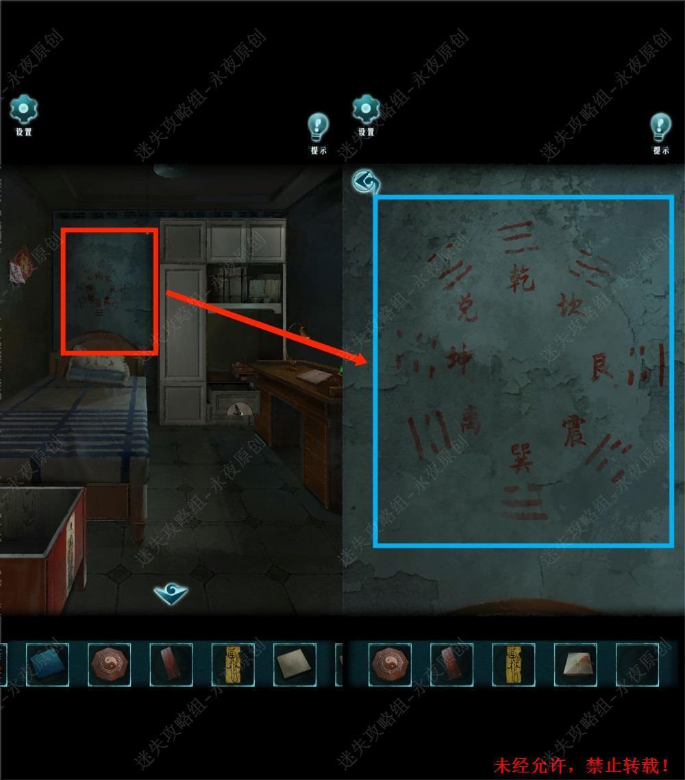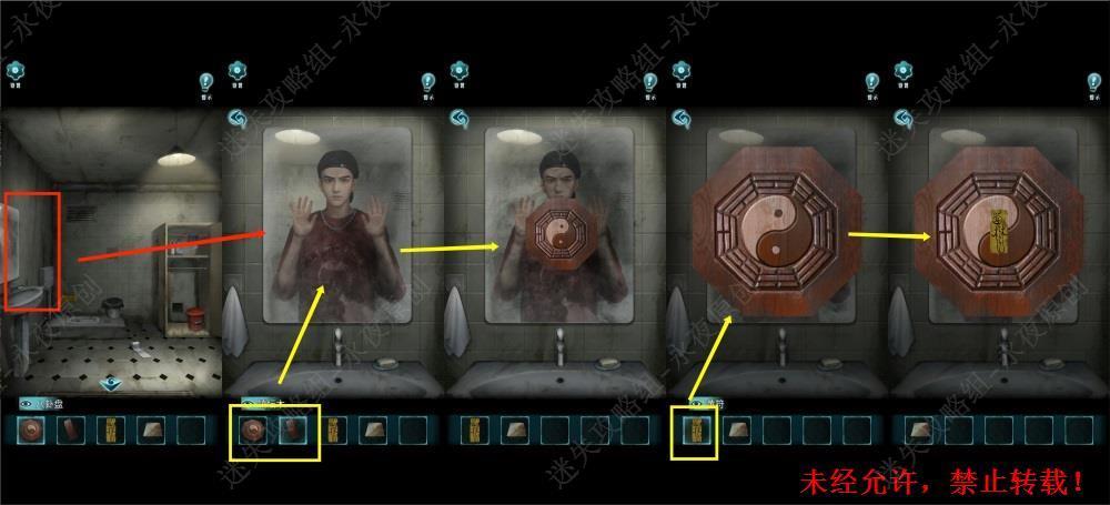 152.进入厕所,调查镜子,使用【镇坛木】,【八卦盘】,【黄符】。根据符箓大全的提示和八卦,将黄符先后移动至离位(即上方),坎位(即下方),坤位(即右上),离位(即上方),乾位(即右下角)。成功从镜子中释放杨文昉。1521,1522