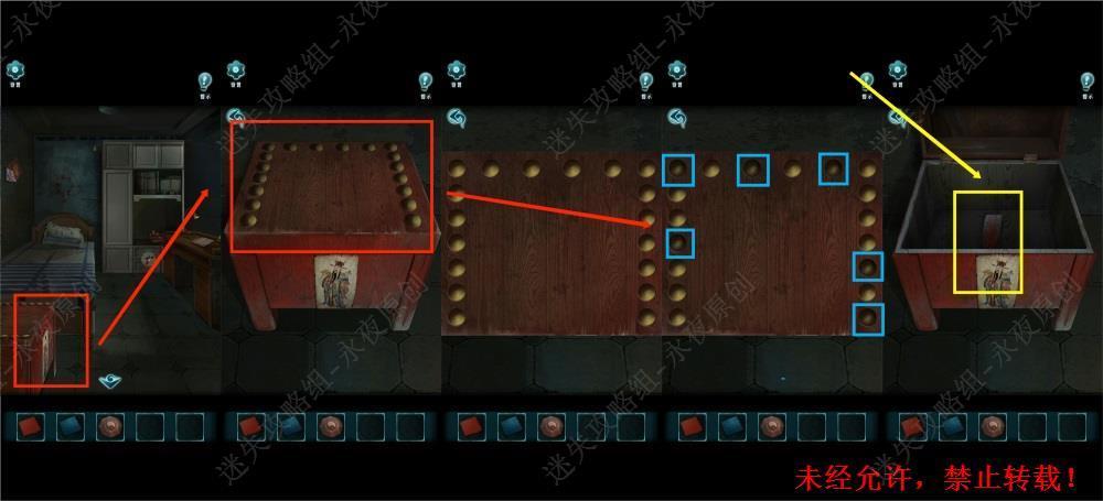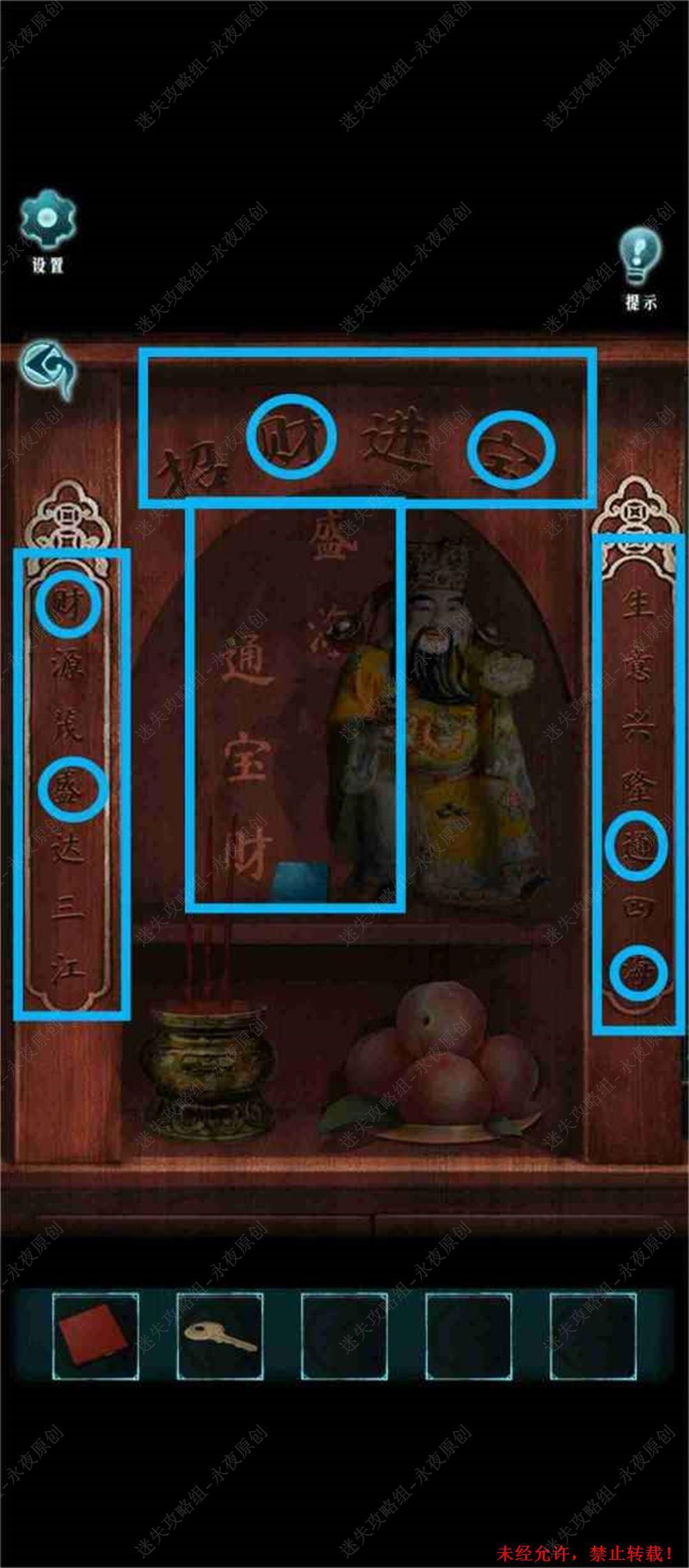 143.进入卧室,调查此处,根据上一步骤中得到的线索,按下对联和横批中出现的“通宝财盛海”字样对应的如图几个按钮,打开箱子,拾取【镇坛木】。143