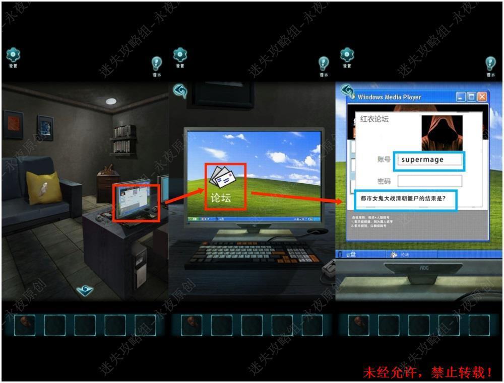 157.进入包厢,调查电脑,点击论坛,触发对话。获得用户名为SUPER MAGE,密码提示为都市女鬼大战清朝僵尸的结果。157